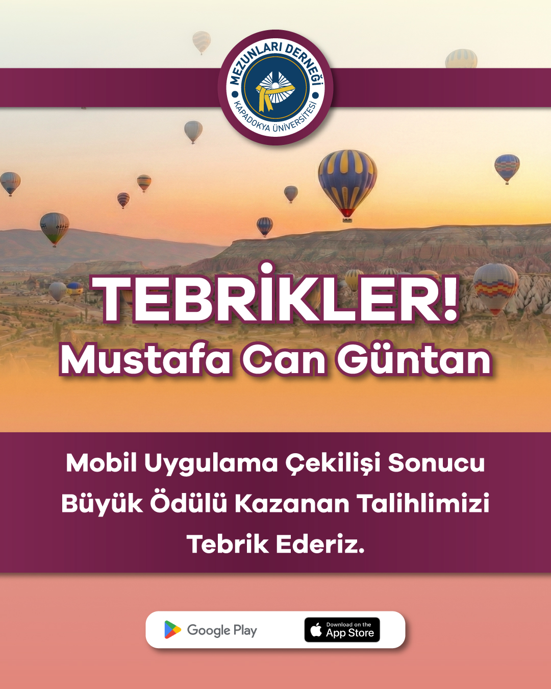 16-31 Ocak tarihleri arasında mobil uygulamamızı indirip bilgilerini güncelleyerek çekilişimize katılan yüzlerce mezunumuz arasından, 4 Şubat tarihinde noter huzurunda yapılan çekilişle büyük ödülün sahibi belirlendi.