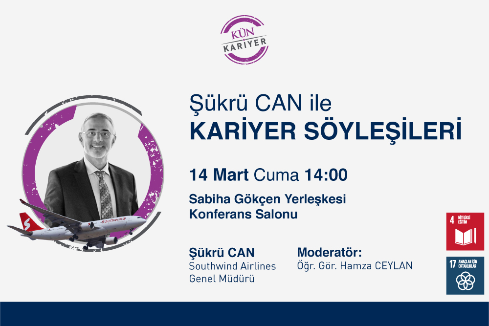 Kariyer Yönetimi ve Mezun İlişkileri Ofisimiz tarafından düzenlenecek Kariyer Söyleşileri’nin konuğu Southwind Airlines Genel Müdürü Şükrü Can olacak. Moderatörlüğünü Öğr. Gör. Hamza Caylan’ın yapacağı şöyleşi, 14 Mart Cuma günü saat 14.00’te Sabiha Gökçen Yerleşkesi Konferans Salonu’nda gerçekleştirilecek.